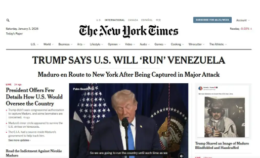 Um dos principais jornais dos Estados Unidos (EUA) – o New York Times (NYT) – publicou neste sábado (3) um editorial criticando as ações do governo de Donald Trump e chamando de ilegal o ataque à Venezuela. Para o jornal, o país sul-americano foi o primeiro alvo da nova doutrina de segurança da Casa Branca para América Latina.