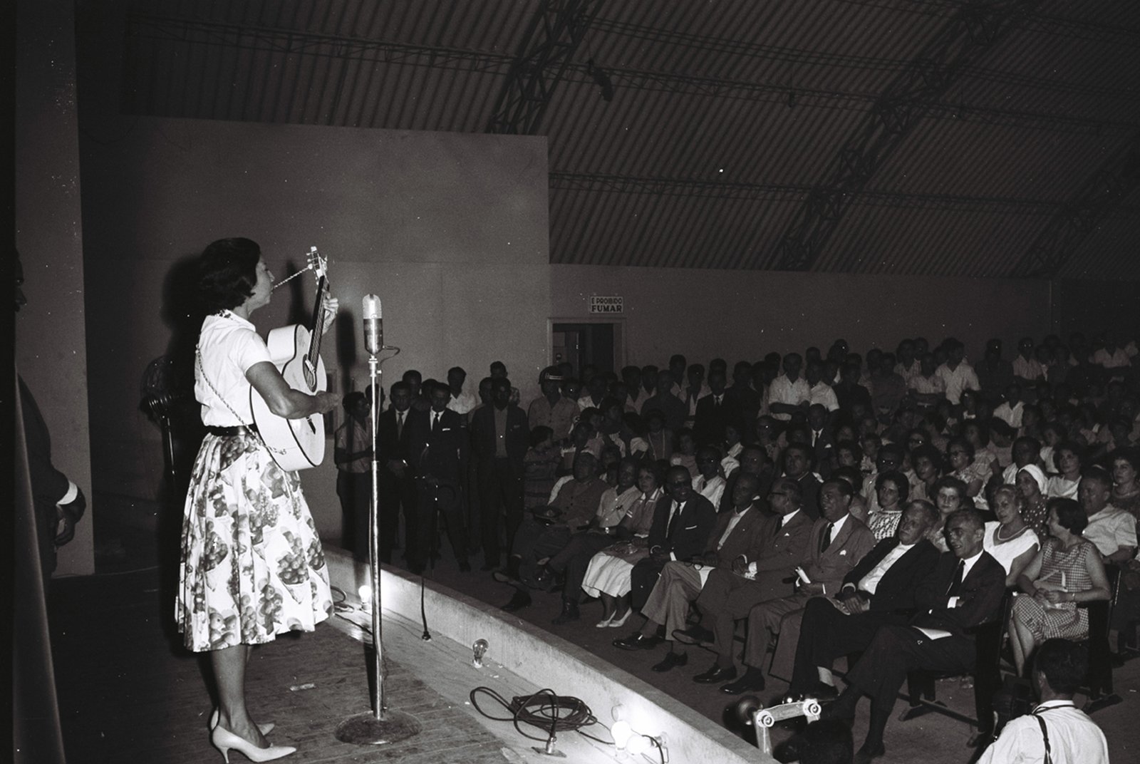 Instalado inicialmente em um grande galpão da 507 sul, na Asa Sul da cidade em formato de avião, o auditório da Rádio Nacional foi palco de diversos eventos – com a apresentação de nomes da MPB e de talentos da música regional e local. Em 1960, o estúdio foi transferido para a quadra 701 sul, no Setor de Rádio e Televisão Sul, e passa a formar rede com a Nacional do Rio de Janeiro. Na imagem, Inezita Barroso se apresenta ao público em 21/04/1959.