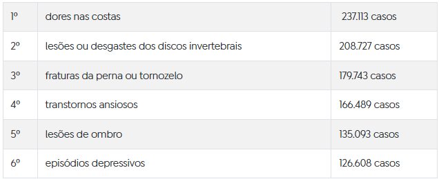 No caso das mulheres, em segundo lugar, aparecem os transtornos ansiosos (118.517), seguidos pelas lesões ou desgastes dos discos intervertebrais (98.305). Já no caso dos homens, em segundo fica a dorsalgia (115.527) e, em terceiro lugar, também as lesões ou desgastes dos discos intervertebrais (110.422), como as hérnias.
