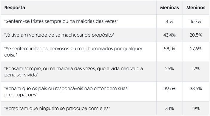 O quadro preocupante sobre a saúde mental dessa população inclui ainda 42,9% dos alunos que responderam que se sentem “irritados, nervosos ou mal-humorados por qualquer coisa” e 18,5% que pensam sempre, ou na maioria das vezes, que “a vida não vale a pena ser vivida”.