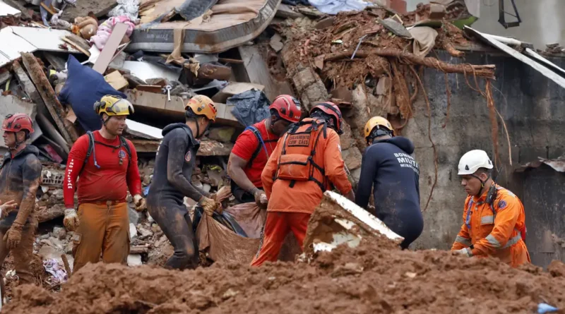 Soldados do Corpo de Bombeiros e voluntários fazem busca e resgate de pessoas em escombros de casas soterradas por lama após fortes chuvas. Foto: Tânia Rêgo/Agência Brasil