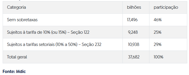 Outros 25% (US$ 9,3 bilhões) passam a estar sujeitos à tarifa global de 10%. Aplicado com base na Seção 122 da Lei de Comércio de 1974, o percentual pode subir para 15% conforme o governo estadunidense.