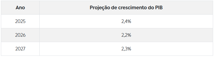 O Ministério da Fazenda tem projeções mais otimistas, com alta de 2,3% em 2025 e de 2,4% em 2026, de acordo com o Boletim MacroFiscal de setembro.