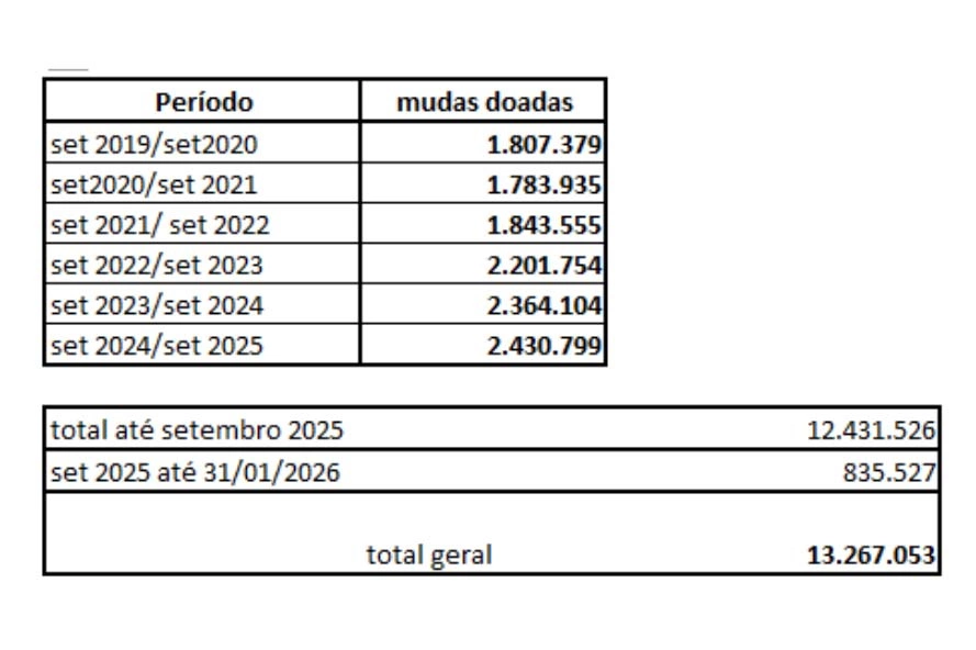No primeiro levantamento, entre setembro de 2019 e setembro de 2020, o projeto entregou 1.807.379 pequenas árvores produzidas por 19 viveiros florestais e dois laboratórios de sementes sob responsabilidade do IAT. Número que saltou para 2.430.799 mudas no último ciclo fechado, de setembro de 2024 a setembro de 2025, um incremento de 34,5% nas doações.