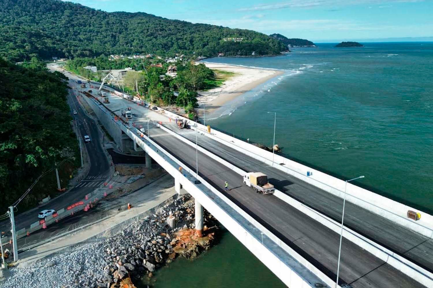 Outra novidade é a continuidade do trabalho de instalação das juntas de dilatação ao longo do tabuleiro da ponte. Esses dispositivos são fundamentais em estruturas de grande porte porque permitem que o concreto armado acomode as dilatações que ocorrem por causa das variações de temperatura. Também seguem em andamento os testes de iluminação. Uma das próximas etapas é o início da instalação da sinalização vertical e horizontal.